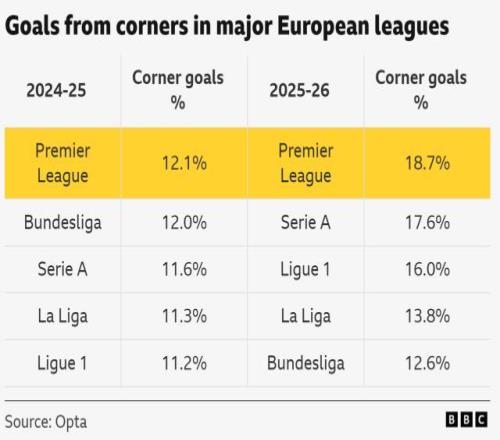 正因此,名宿卡拉格直言,阿森纳中卫加布里埃尔才是“全英超最具影响力的球员”。上轮联赛,坐镇主场的枪手,又是凭借一次任意球高空轰炸,由埃泽攻入全场唯一进球,藉此击退水晶宫。阿尔特塔坦言,定位球进攻就是大势所趋,“我们注意到了这个潮流变化。如今,随着球员们身体机能愈发强劲,比赛方法的贯彻愈发高效,足球是越来越难踢了,因为对手可以限制空间,可以在身体机能上占据优势。因此,你必须找到其他进球方法,大家都在这么做。” 阿森纳的超高定位球占比算是极端案例,其他球队通常没有走得这么远,但也都在加强这一手段。比如枪手的北伦敦近邻热刺,上轮客场3比0大胜埃弗顿,前2粒进球就都是范德芬在角球进攻中头槌得手,主帅弗兰克总结:“定位球是如此重要,现在阿森纳就是依靠定位球走在夺冠的道路上。” 曾几何时,定位球被视作弱队的营生手段,是斯托克城之流以弱克强的法宝。而本赛季9轮战罢,仅角球一项,便占据英超总进球的18.7%,总计241球中有45球由此而来,这一比例显著高于英超往年的最高值(14.2%)。而定位球进球(不计点球)的总占比,则达到27.8%,大大高于最近10年的次高纪录(2025-16赛季,21.65%)。 这个趋势不仅存在于英超,五大联赛的角球破门占比都比前一赛季有了提高。英超是从12.1%提升为18.7%,德甲和意甲也有类似的明显涨幅,西甲和法甲的涨幅则低出不少(下表)。