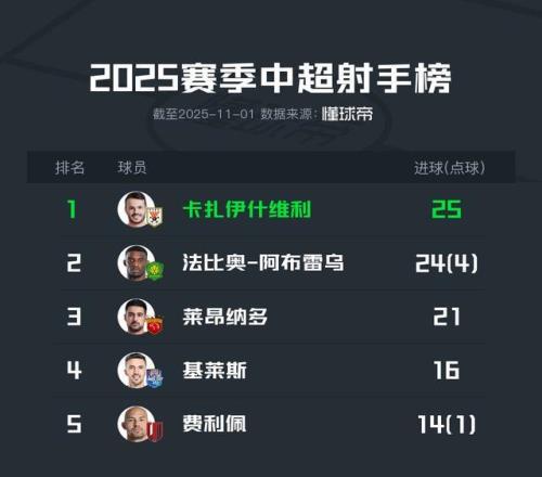 | 中超第29轮,瓦科破门+失点,法比奥双响,两人进球数分别来到25粒和24粒,射手榜第三名的莱昂纳多攻入21球,争夺金靴的可能性不大。